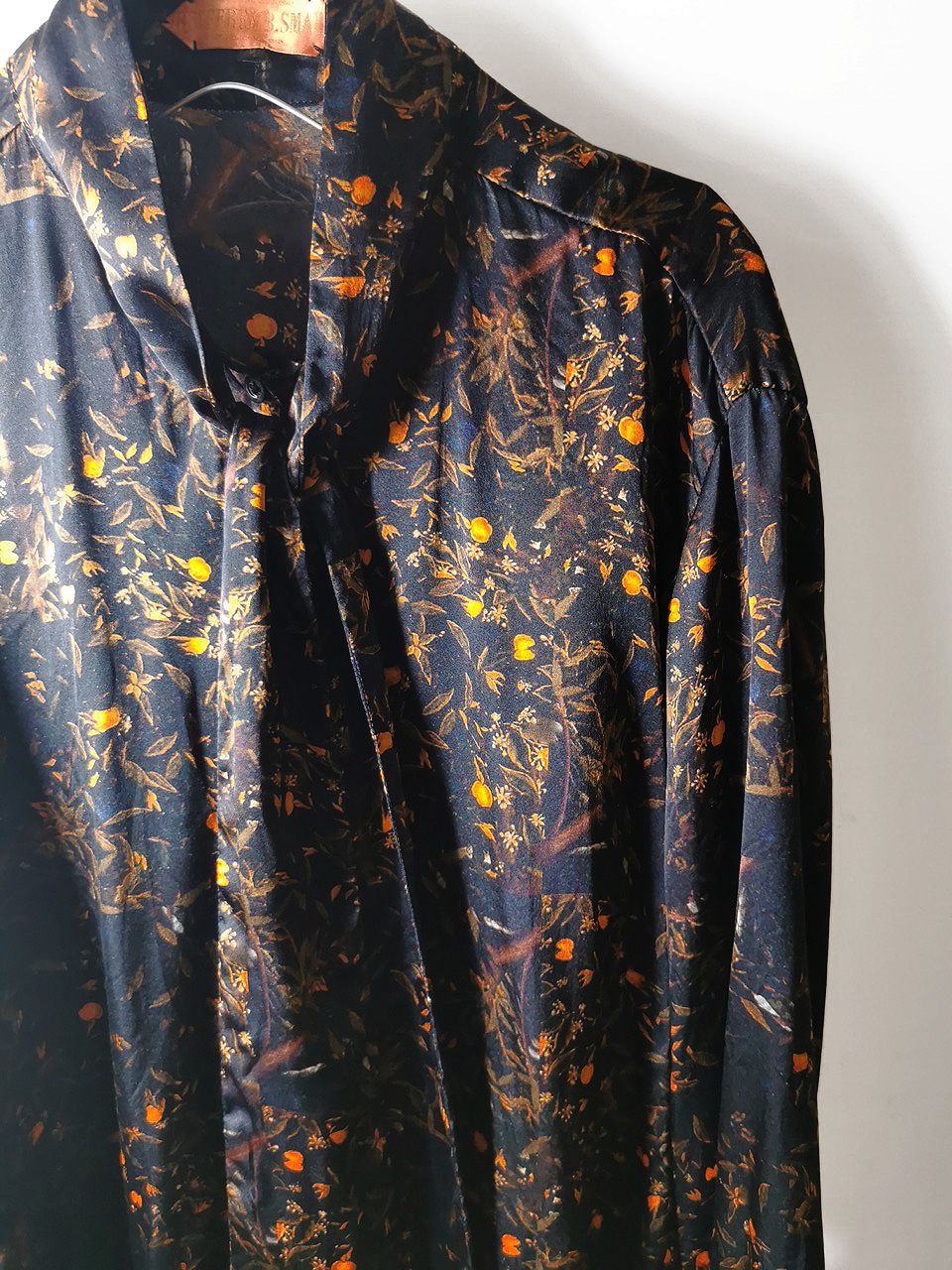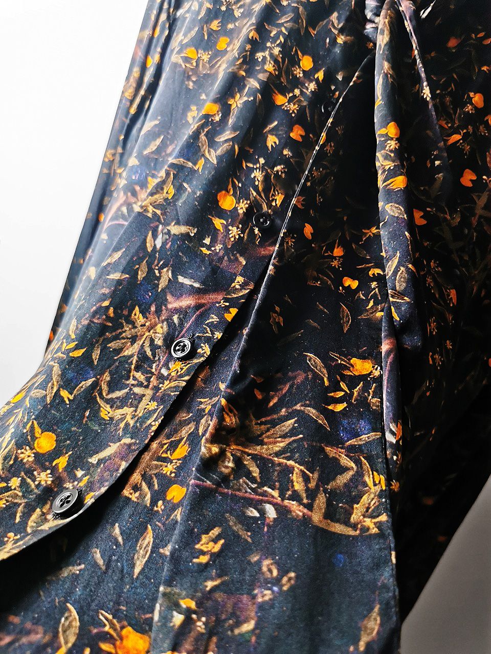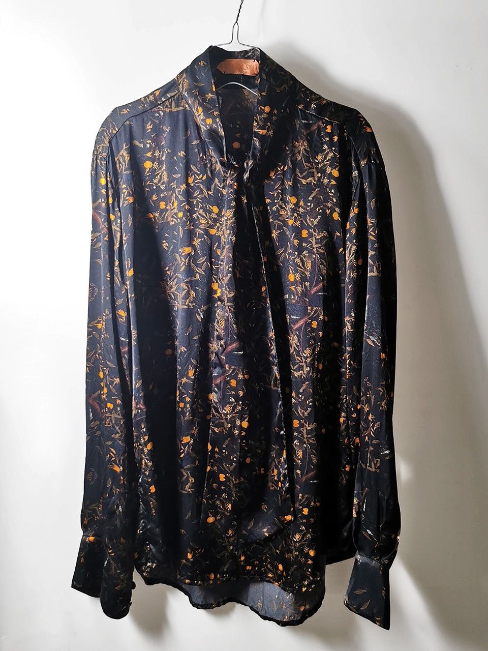 THIS special version of the super limited edition SEWS03 handmade shirt design is one of only 2 pieces of its kind made by hand in the entire world, each exclusively for Journal Standard Luxe in Japan from our collar-tie long sleeves shirt pattern from our extensive tailoring research and cut using a pure silk 16 momme raso satin exclusive Botticelli floral print fabric made only for us by the legendary Brenna family in Como, Italy--the world’s leading center for fine silk fabric creation--then individually washed and treated by hand in our world-famous GBS Superworkrooms at Cavarzere Venezia for extra aging, shaping, drape and incredible softness...